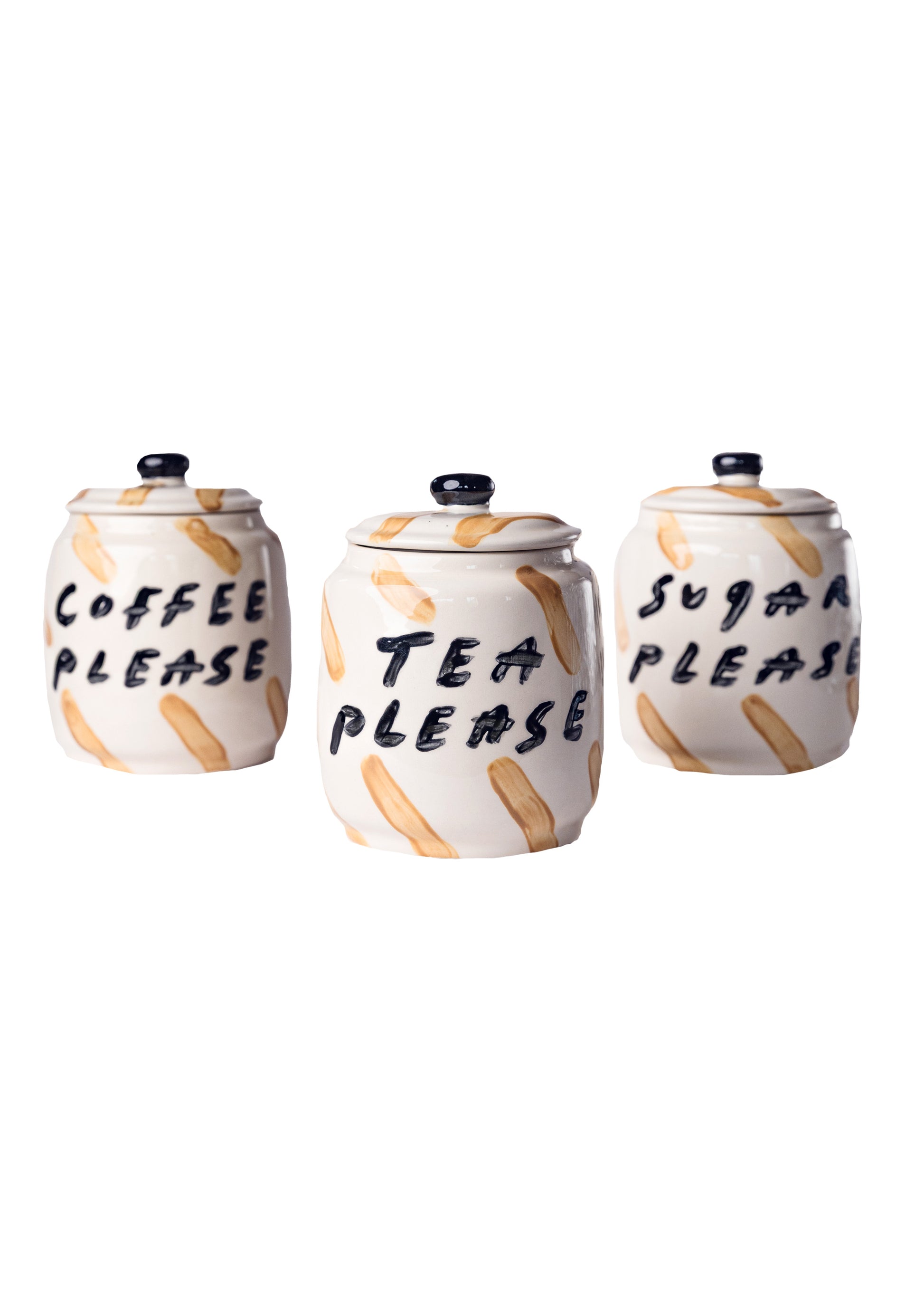 Bring a splash of charm to your kitchen with this joyful trio of hand-painted ceramic canisters. Featuring Tatiana Alida’s signature handwriting and playful use of colour, each canister is a celebration of everyday rituals—designed to keep your tea, coffee, and sugar beautifully organised and always within reach.