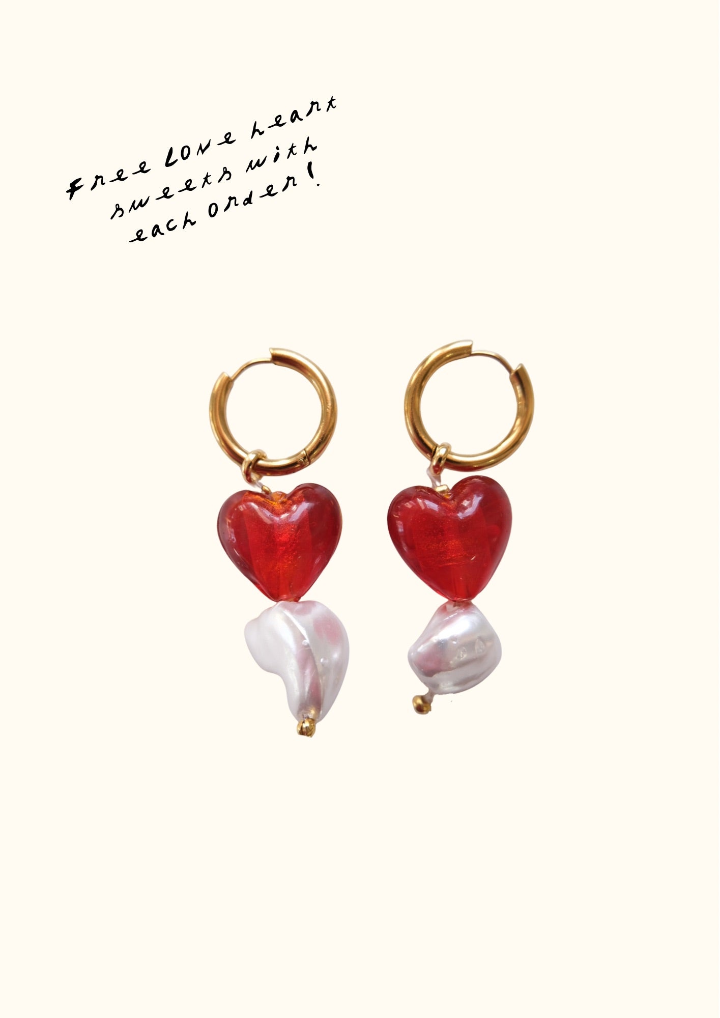 Playful, romantic and effortlessly wearable, these delicate hoop earrings feature hand-crafted glass hearts paired with soft baroque pearl drops, creating a beautiful contrast between shine, texture and movement.