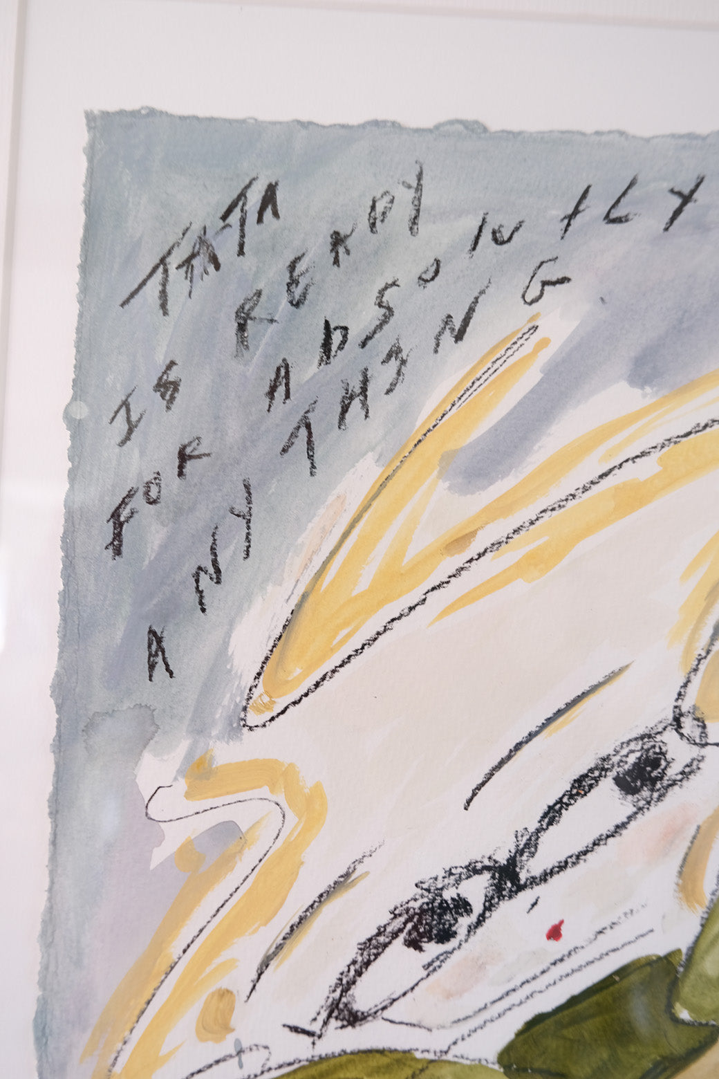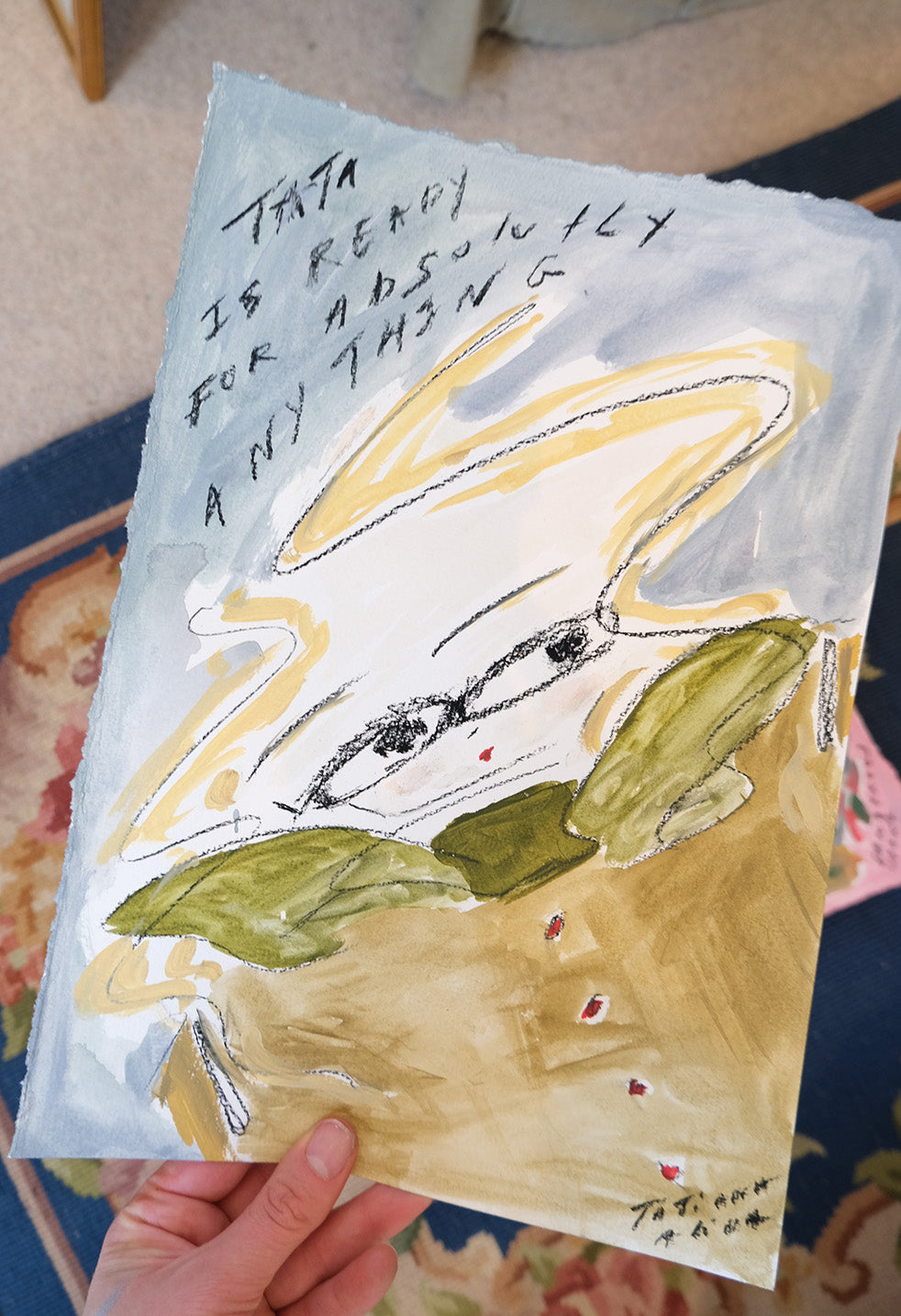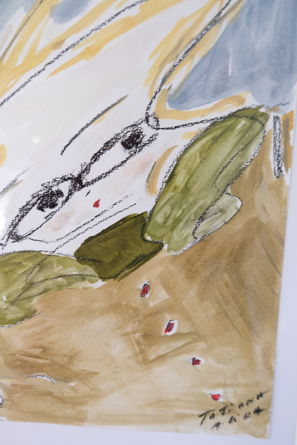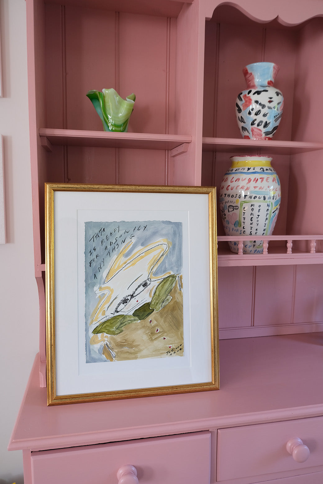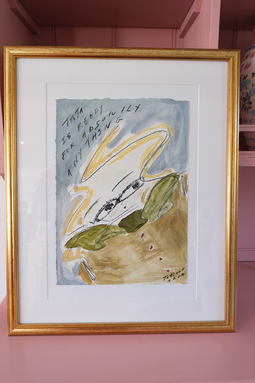Original water colour and charcoal illustration by Tatiana Alida. A3 mounted in Gold frame. Featuring her character called Tata.