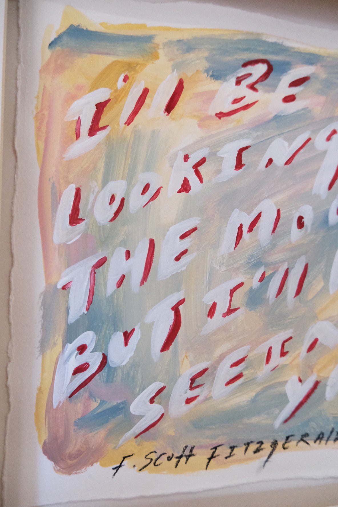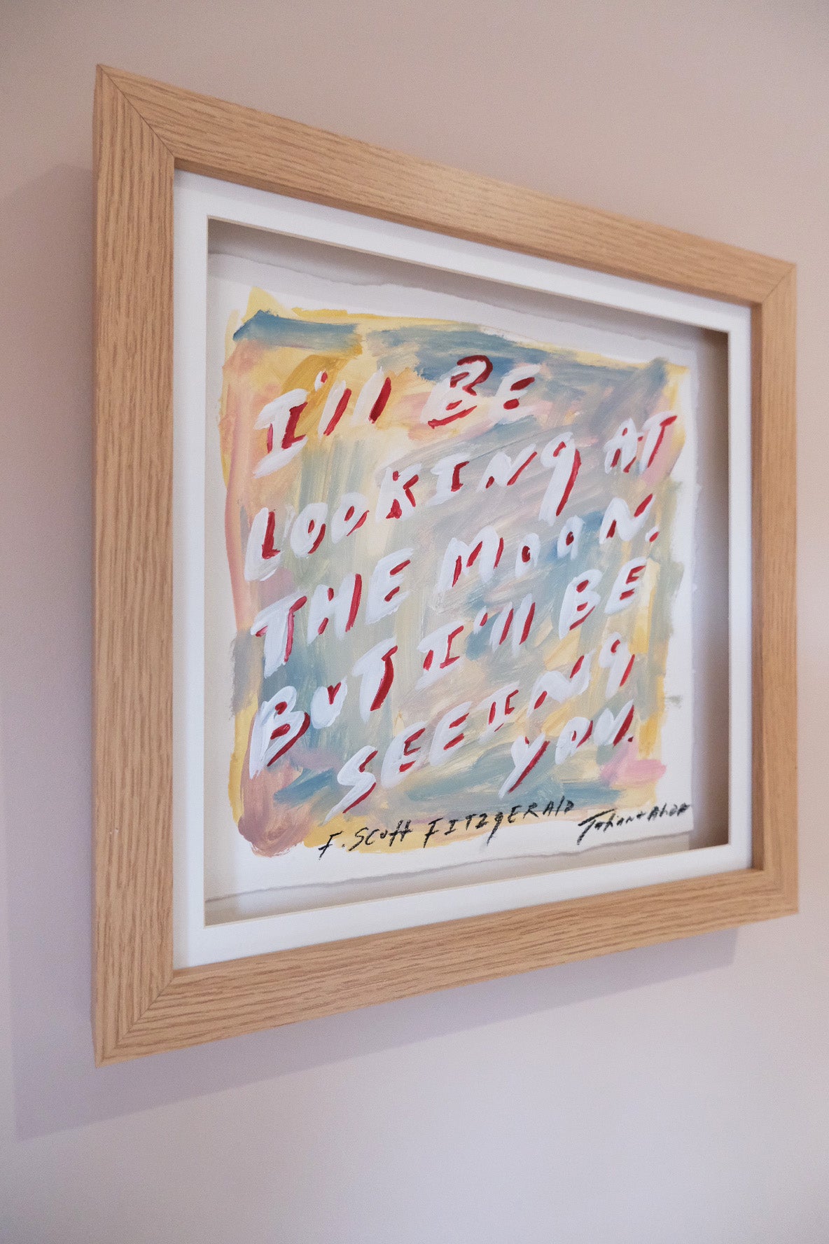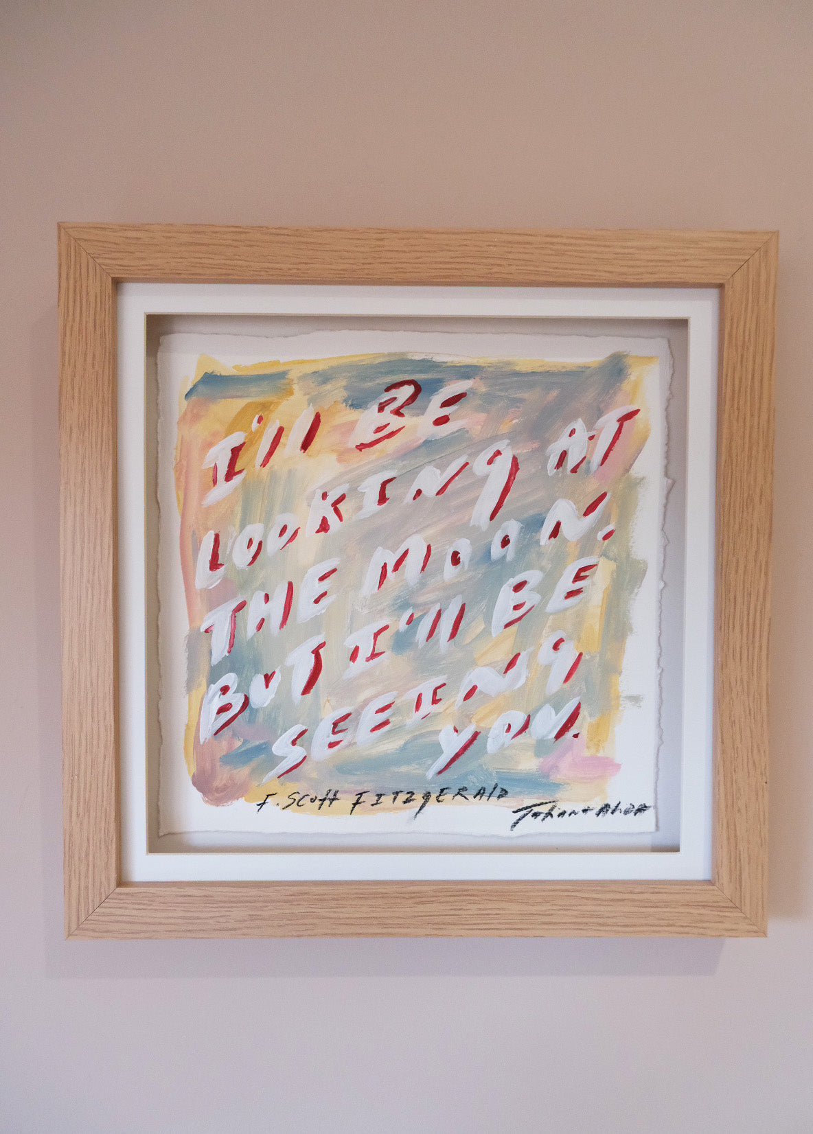 Inspired by the F. Scott Fitzgerald quote, this piece reflects the feeling of distance without absence how love continues in thought, in habit, in the small rituals of everyday life. Layered washes of warm and muted colour hold expressive handwritten text, giving the painting a sense of softness and nostalgia.